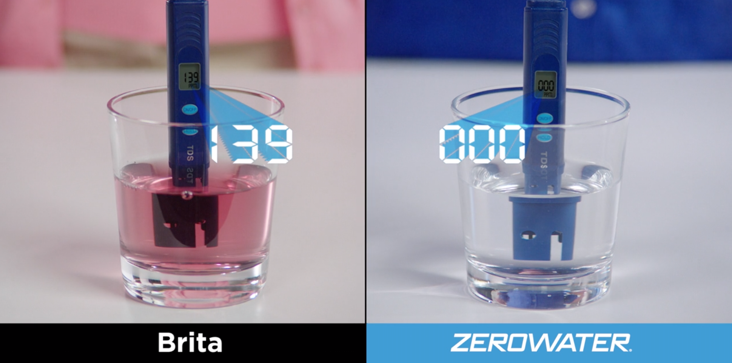 We took a pitcher of clear water, added some wine to it, then poured the water into both a Brita pitcher and the ZeroWater® pitcher. Like magic, the water in the ZeroWater® pitcher was crystal clear and read all zeros on the TDS meter. The Brita pitcher water was pink and measured over 139 on the TDS meter, clearly showing the dominance of the 5-stage ZeroWater® filter over Brita’s generic 2-stage filter.